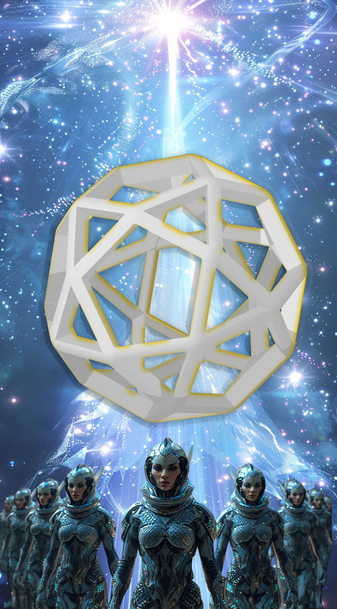 Fusion géométrique : Ce polyèdre est l’intersection vibratoire entre l’icosaèdre (eau, émotion, réceptivité) et le dodécaèdre (éther, esprit, quintessence). Il incarne une interface entre les plans subtils et les plans densifiés, idéal pour une structure de navigation interdimensionnelle.