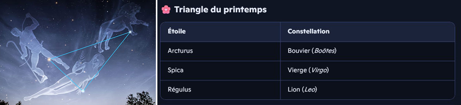 Activer les 3 constellations et les 3 étoiles principales de l’astérisme du triangle de printemps.
